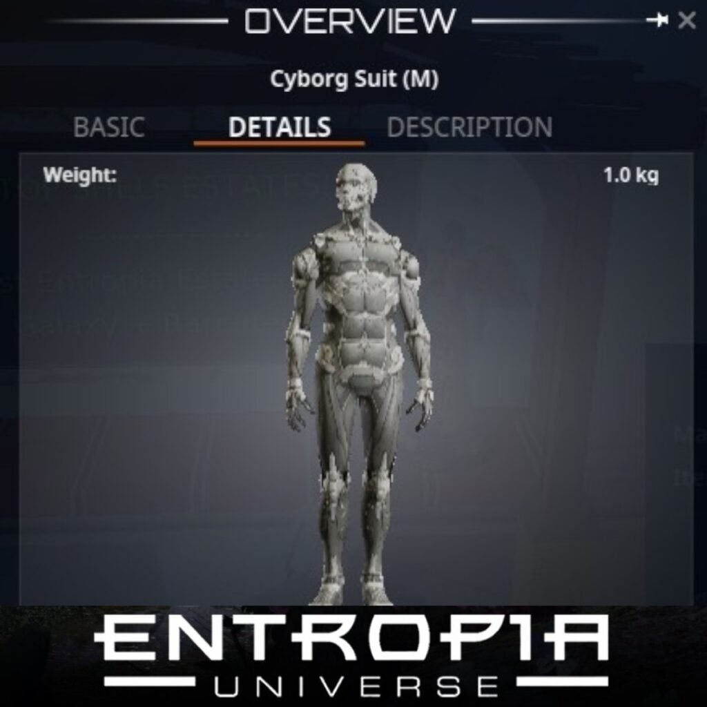 Cyborg Suit (M) เป็นชุดเกราะที่มีความนิยมในเกม Entropia Universe โดยมีคุณสมบัติและรายละเอียดดังนี้:
