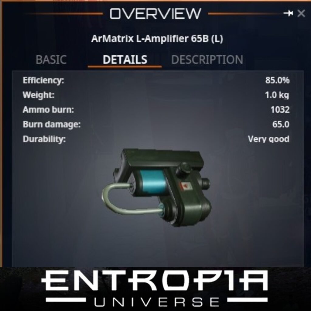 ArMatrix L-Amplifier 65B (L) เป็นอุปกรณ์ในเกม Entropia Universe ที่ใช้เพื่อเพิ่มพลังโจมตีของอาวุธ โดยเฉพาะอาวุธประเภท Laser ซึ่งเหมาะสำหรับผู้เล่นที่ต้องการเพิ่มประสิทธิภาพในการต่อสู้