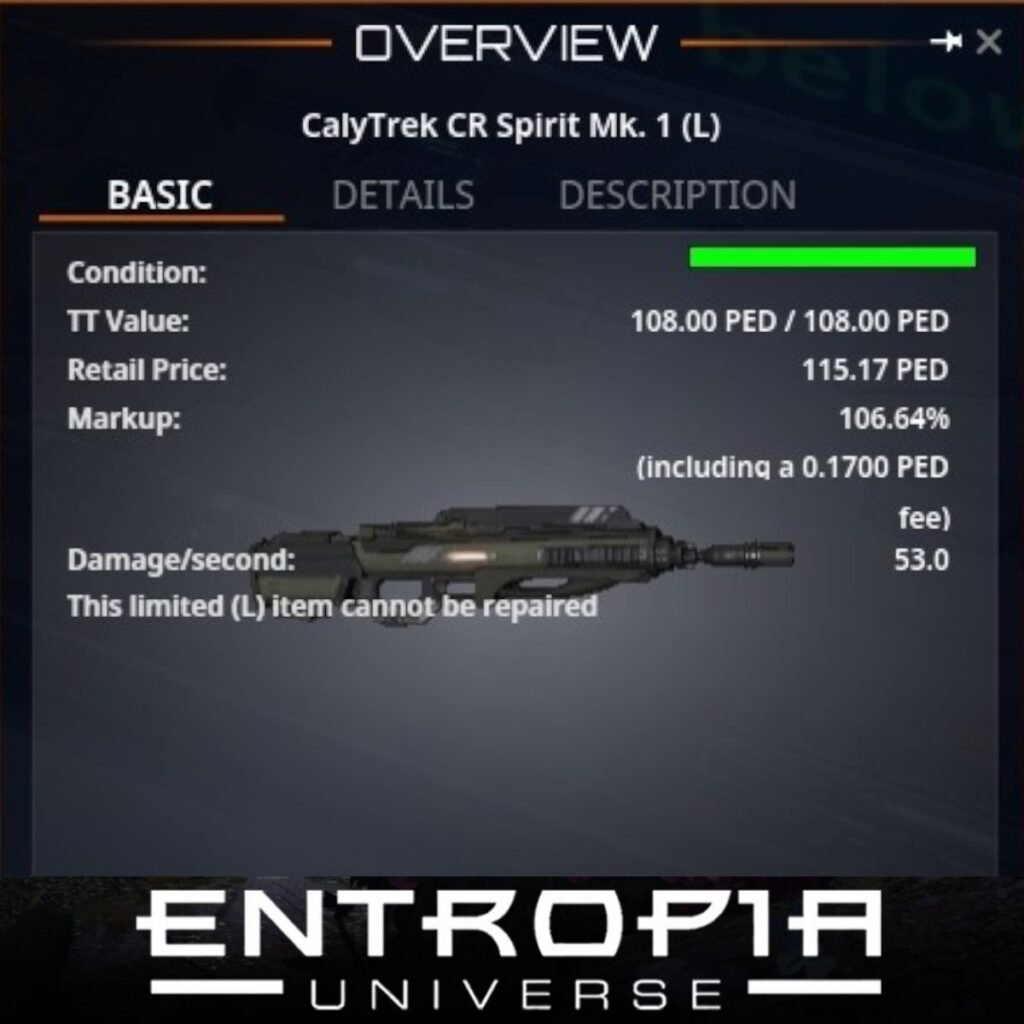 CalyTrek CR Spirit Mk. 1 (L) เป็นปืนไรเฟิลเลเซอร์ที่มีคุณสมบัติที่น่าสนใจในเกม Entropia Universe ซึ่งเหมาะสำหรับผู้เล่นที่ต้องการอาวุธที่มีประสิทธิภาพในการต่อสู้