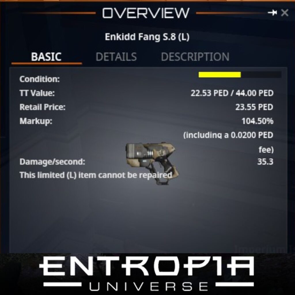 Enkidd Fang S.8 (L) เป็นอาวุธประเภทมีดในเกม Entropia Universe ที่มีคุณสมบัติเด่นดังนี้: