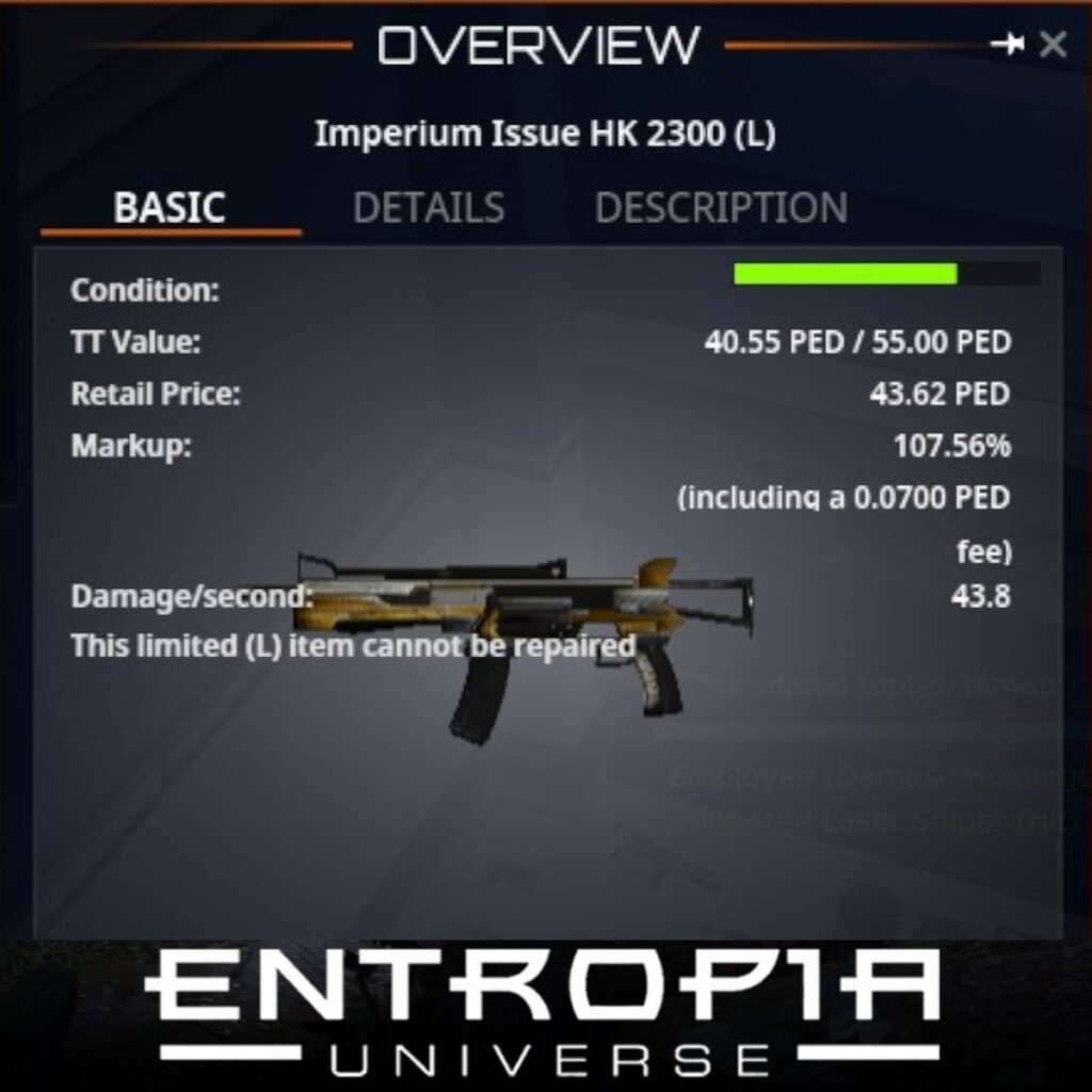 Imperium Issue HK 2300 (L) เป็นอาวุธประเภทปืนในเกม Entropia Universe ที่มีคุณสมบัติที่น่าสนใจดังนี้: