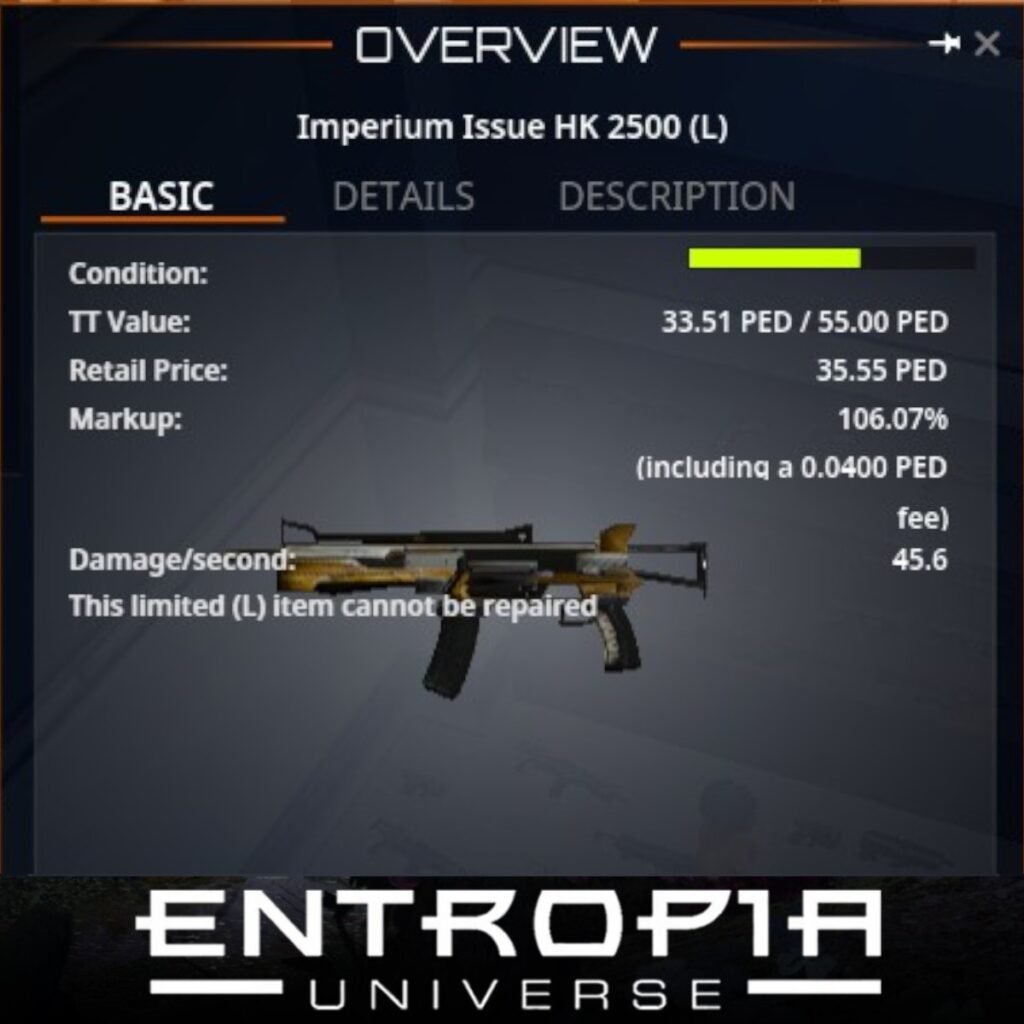 Imperium Issue HK 2500 (L) เป็นอาวุธประเภทปืนในเกม Entropia Universe ที่มีคุณสมบัติที่น่าสนใจ ดังนี้: