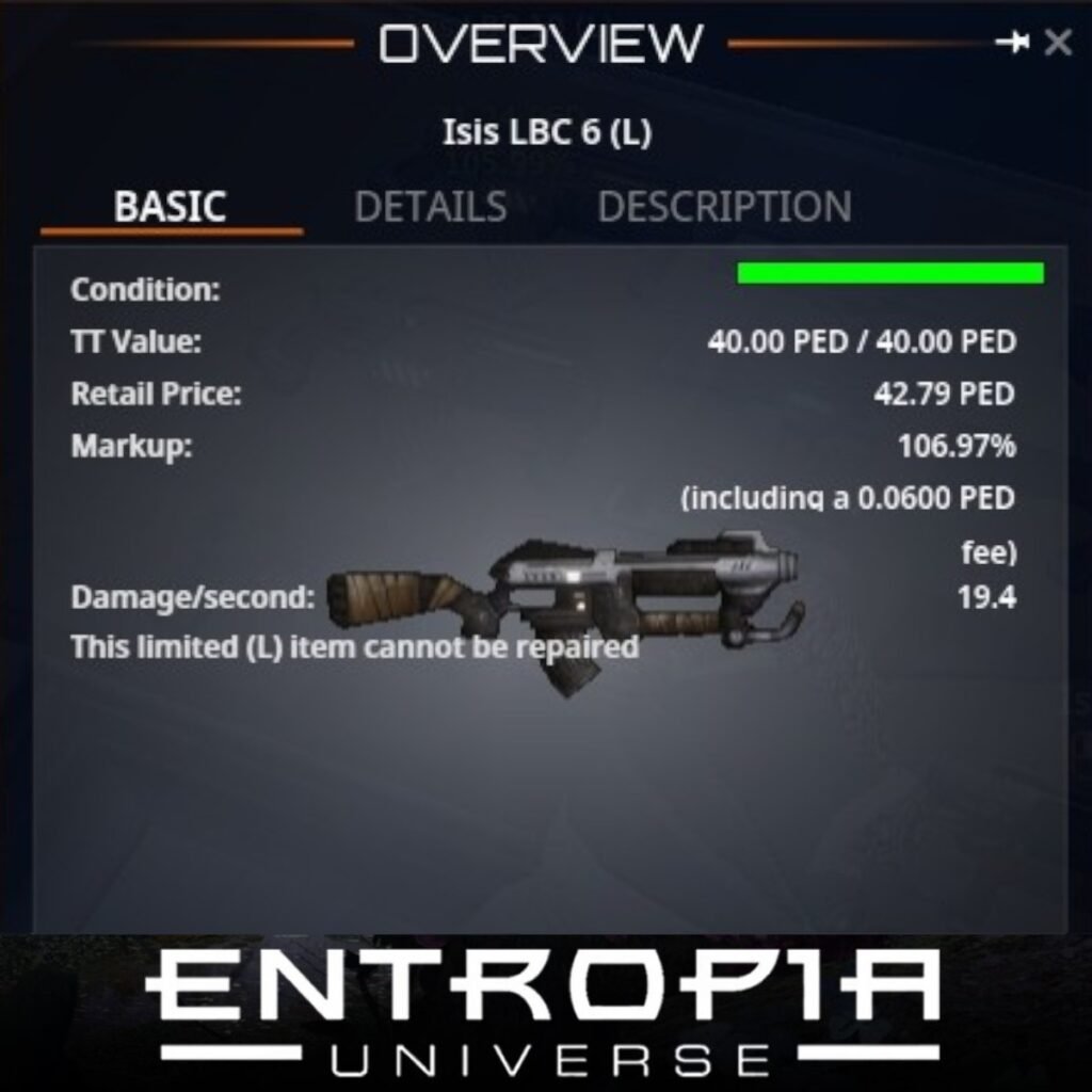 Isis LBC 6 (L) เป็นอาวุธที่มีความนิยมในเกม Entropia Universe โดยเฉพาะสำหรับผู้เล่นที่ต้องการประสิทธิภาพในการต่อสู้ที่สูงในระยะกลางถึงไกล