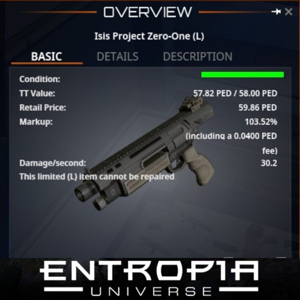 Isis Project Zero-One (L) ในเกม Entropia Universe เป็นอาวุธประเภท Laser Pistol ที่มีคุณสมบัติพิเศษและความสามารถในการทำดาเมจที่ดีในช่วงเกม โดยมีรายละเอียดดังนี้: