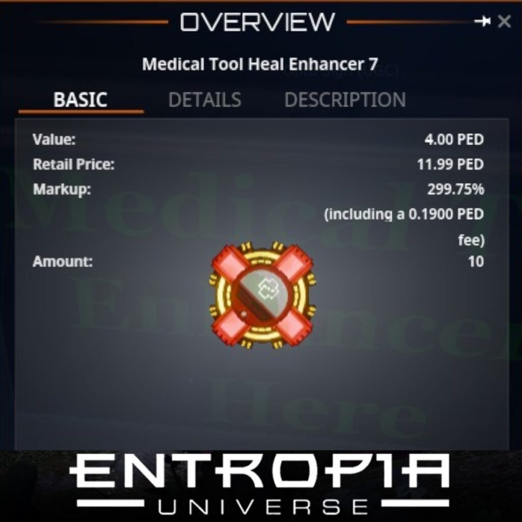 Medical Tool Heal Enhancer 7 เป็นอุปกรณ์เสริมที่มีประสิทธิภาพสูงสุดในกลุ่มเครื่องมือการแพทย์ในเกม Entropia Universe โดยออกแบบมาเพื่อเพิ่มความสามารถในการฟื้นฟูสุขภาพให้กับผู้เล่นได้อย่างรวดเร็วและมีประสิทธิภาพมากยิ่งขึ้น