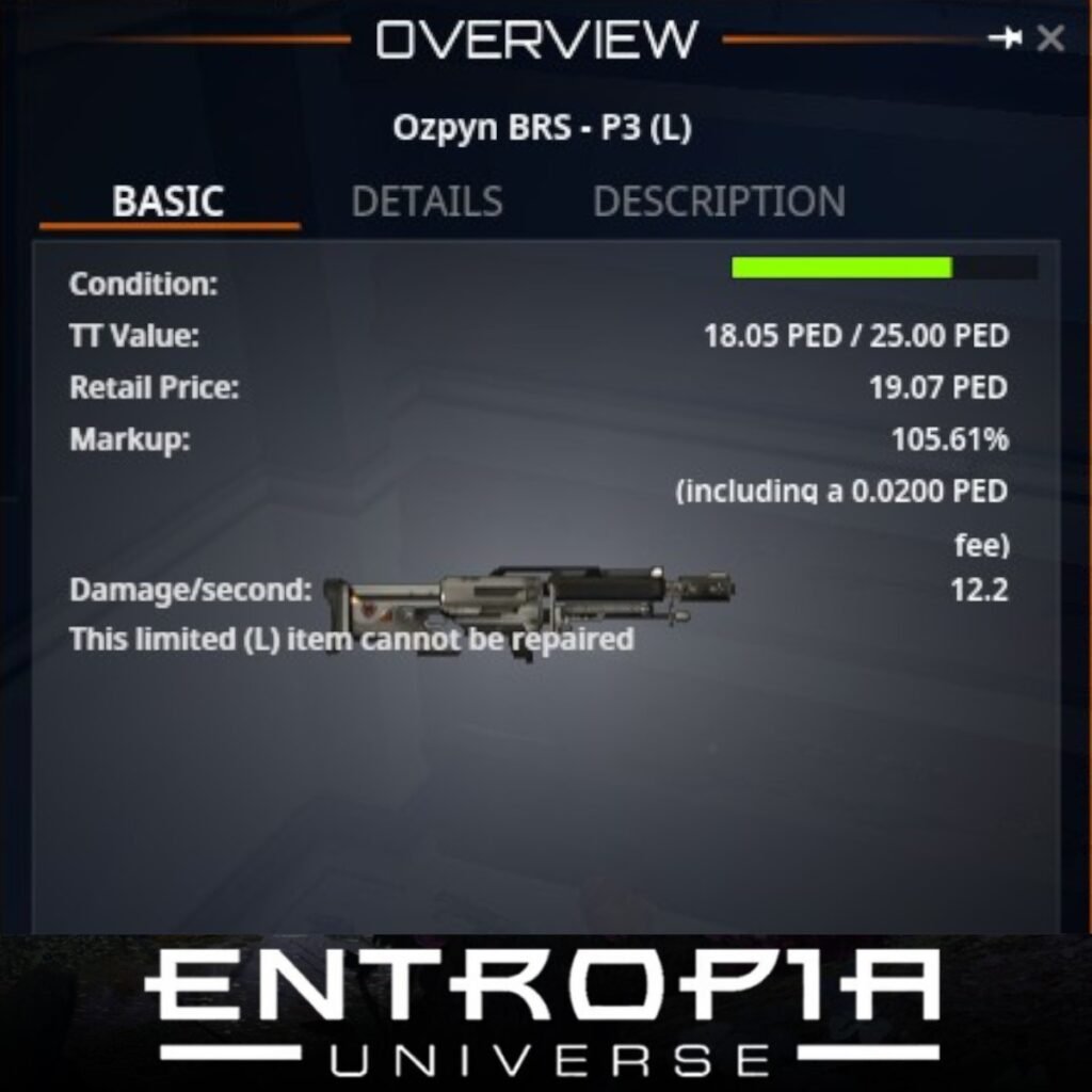 Ozpyn BRS – P3 (L) เป็นอาวุธประเภทปืนในเกม Entropia Universe ที่มีคุณสมบัติที่น่าสนใจดังนี้: