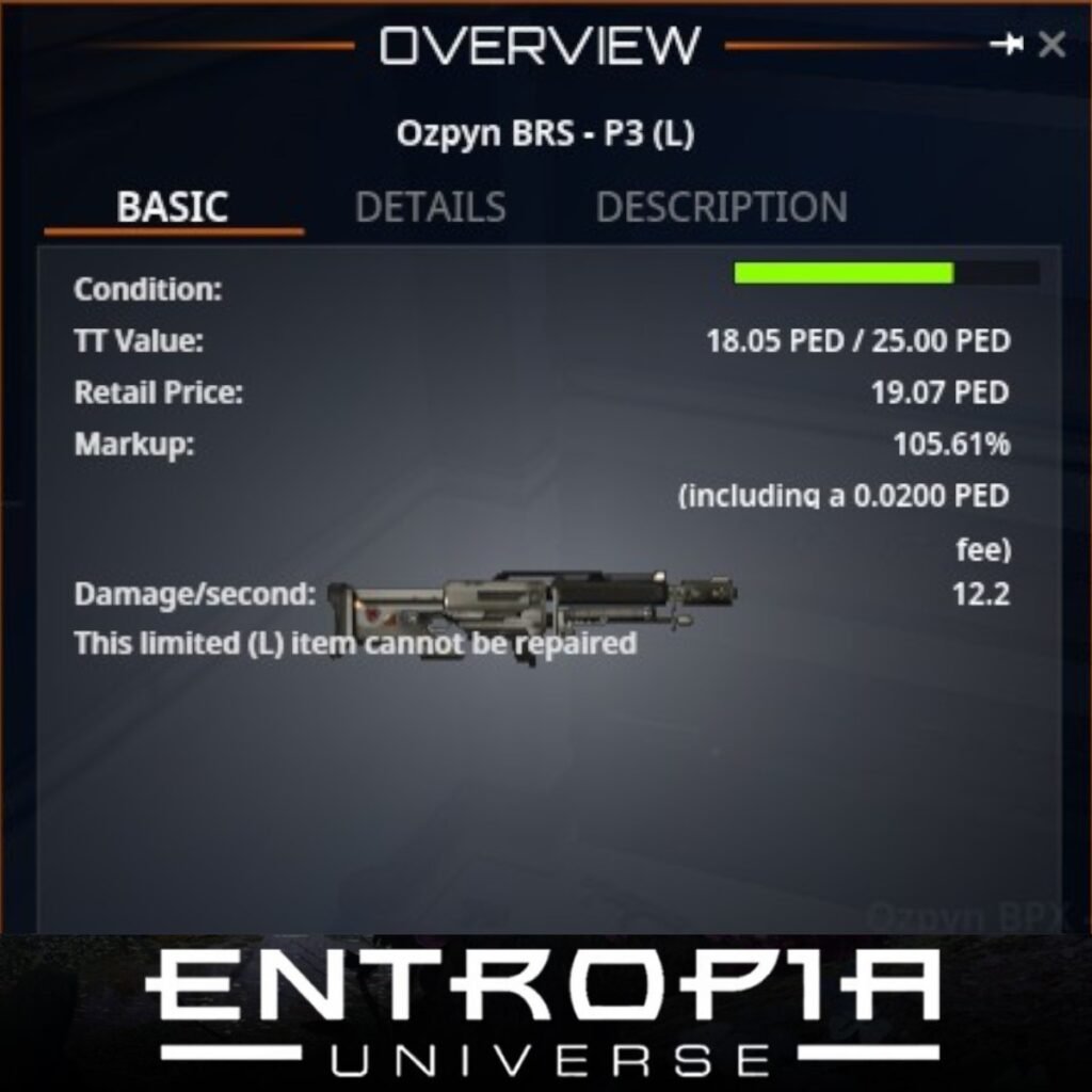 Ozpyn BRS – P3 (L) เป็นอาวุธประเภทปืนไรเฟิลในเกม Entropia Universe ที่มีคุณสมบัติที่น่าสนใจ ดังนี้: