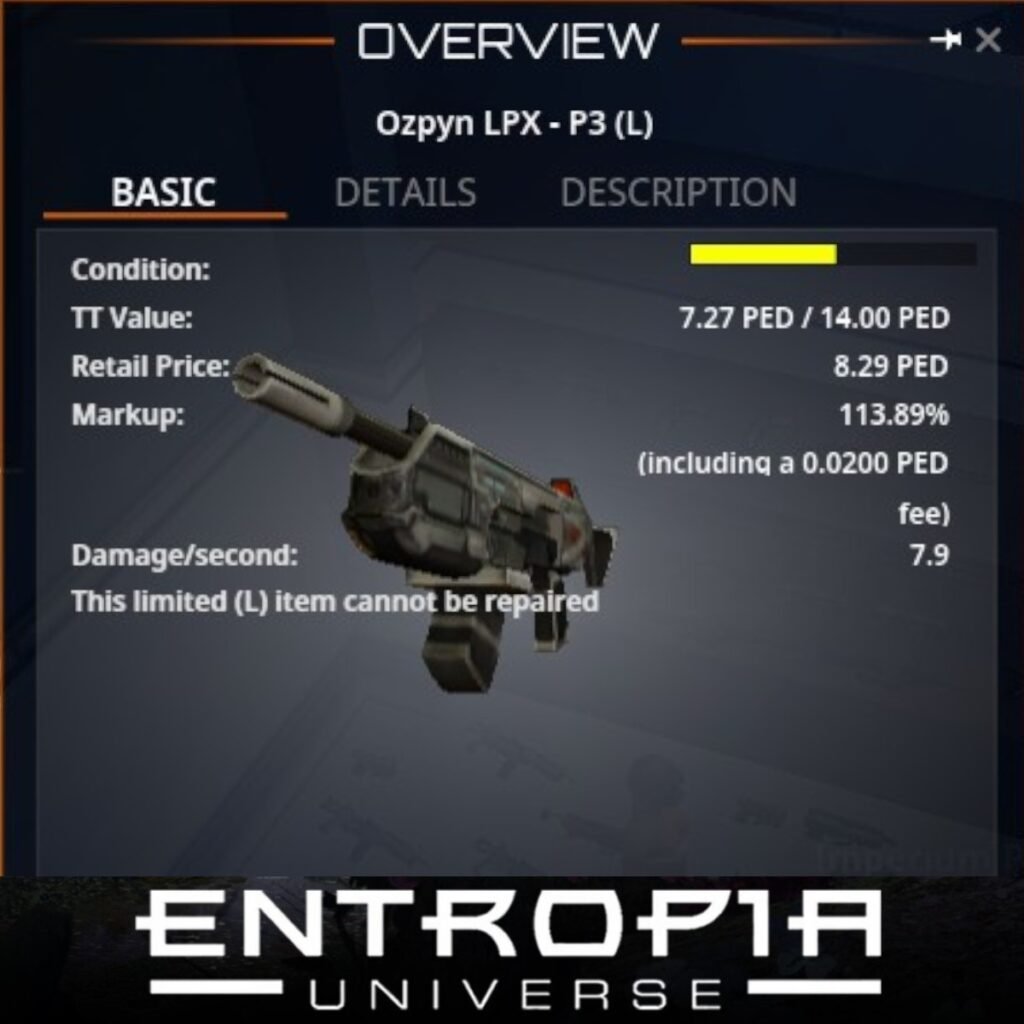 Ozpyn LPX – P3 (L) เป็นอาวุธประเภทปืนในเกม Entropia Universe ที่มีคุณสมบัติที่น่าสนใจ ดังนี้:
