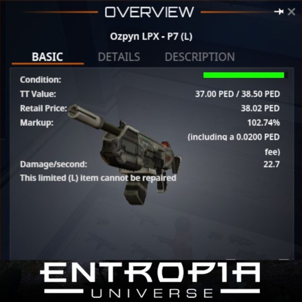 Ozpyn LPX – P7 (L) เป็นอาวุธประเภทปืนในเกม Entropia Universe ที่มีคุณสมบัติที่น่าสนใจ ดังนี้: